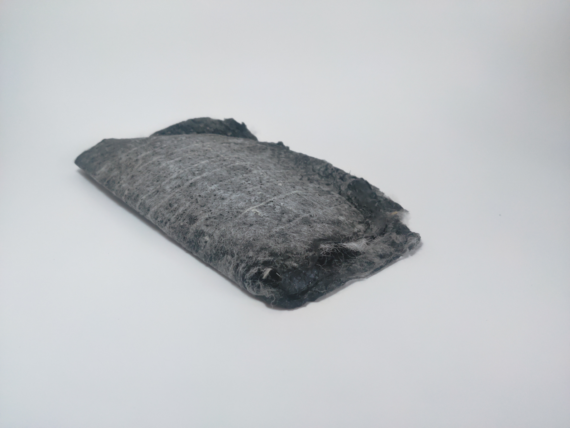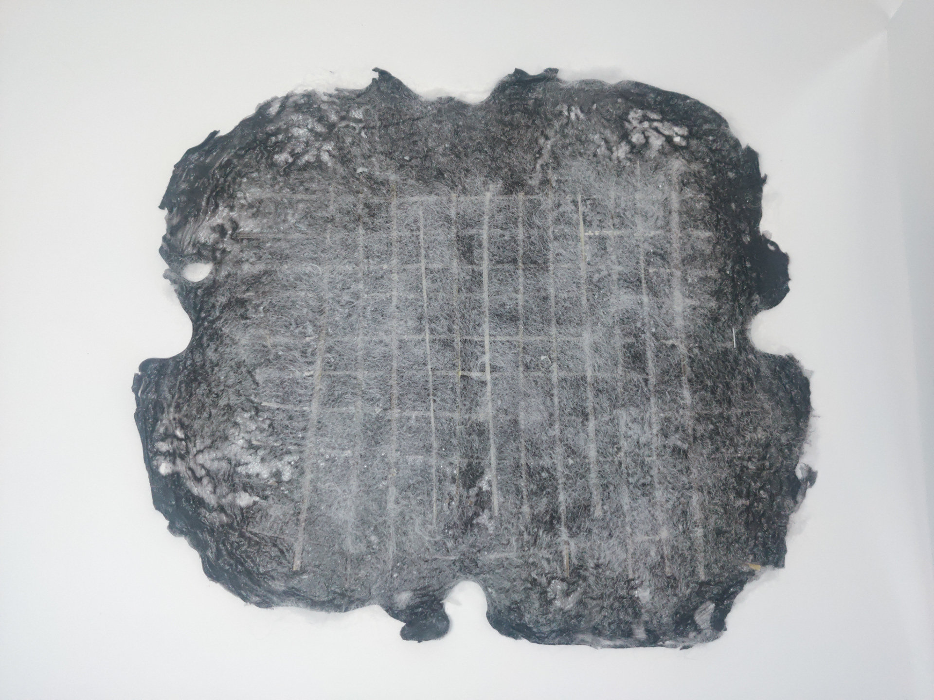 Composite material created with scoured wool, agar agar bioplastic, charcoal, and Cow Parsley fibres.